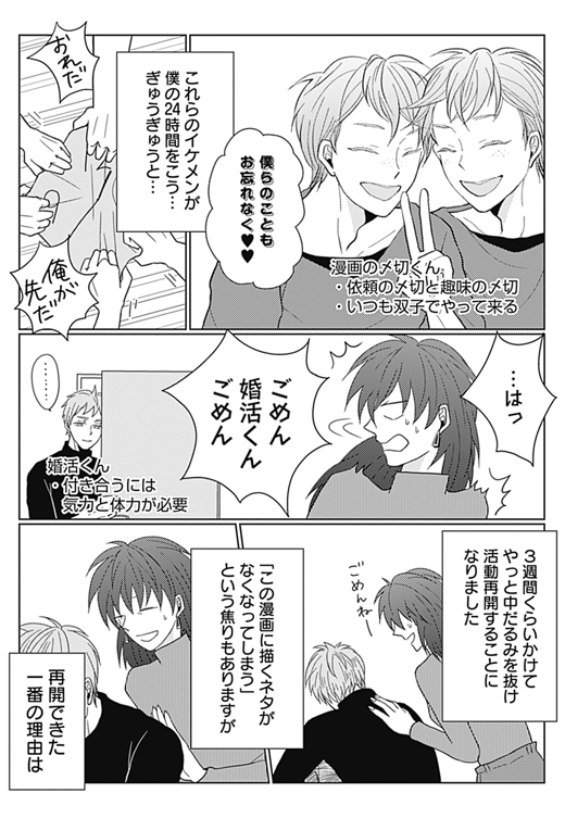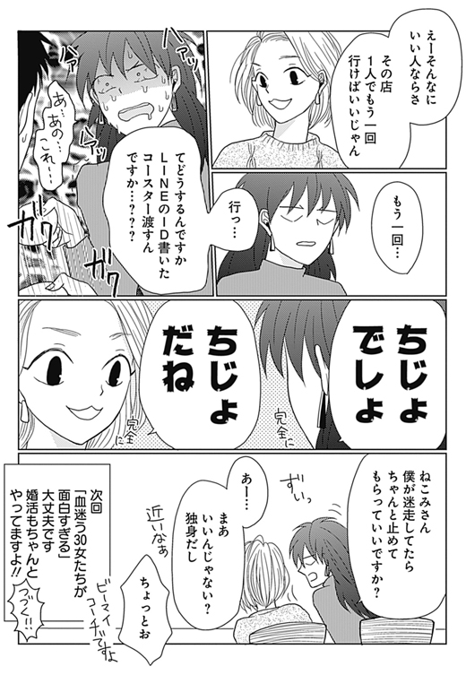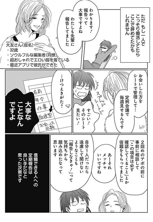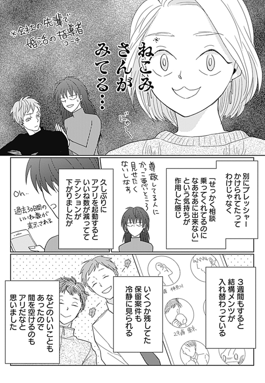 来ますねー。私の場合は、職場の先輩で「婚活の定期報告」をしているねこみさん(1話参照)の存在が大きくて。1人でやっていたら今頃やめていたかもしれません。ねこみさんへの定期報告は今も続けていて、コミックスの書き下ろしに当たって話を聞きに行ったりもしました。