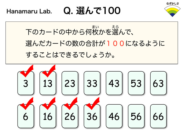 次に一の位に着目します。合計を100にするためには、一の位が0にならなくてはならない、ということから何枚選ぶべきかを考えると、例えば下の段の「一の位が6であるカード」を5枚選ぶ、という方法が考えられます。