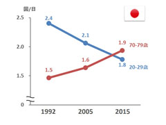移動回数を年齢別に見ると、20代は年々減少。その一方で70代は増加傾向に