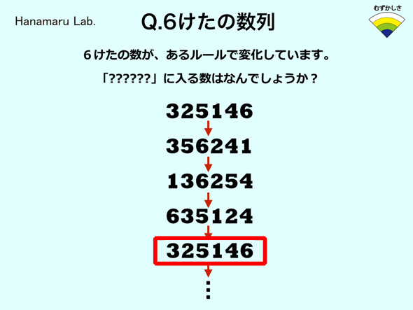 例えば、最初の「325146」では、1は右から「3」番目、2は右から「5」番目、3は右から「6」番目、4は右から「2」番目、5は右から「4」番目、6は右から「1」番目。これらをつなぎあわせた「356241」が、次の6けたの数になっているというわけです。