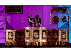 特に目立ったのがミャンマー代表。屋台のような大道具を携えて入場したと思ったら、左右に展開して舞台装置に仕立て、楽器を演奏して見せました。衣装は上半身しか見えないのが斬新です。