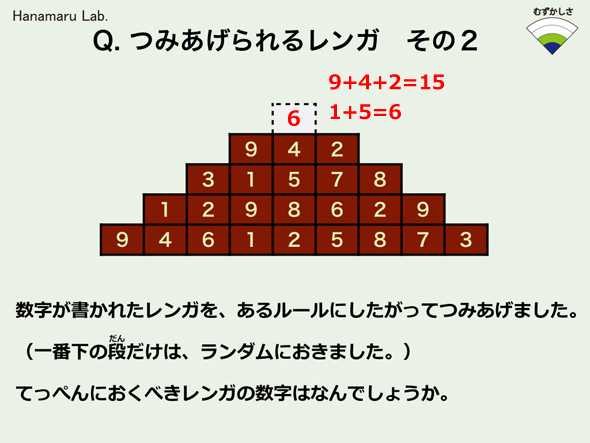 レンガに入る数字は、そのレンガの左下、真下、右下の3つの数字を足して、さらにその和の十の位の数字と一の位の数字を足し、それでも10を超える場合はさらにその和の十の位の数字と一の位の数字を足すことによって決まります。