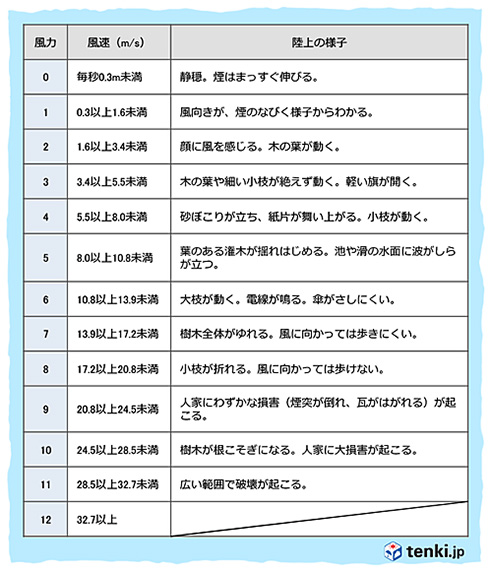 また、気象庁が公開している「風の強さと吹き方」という資料では、秒速20メートル以上からは「非常に強い風」と表現され、「何かにつかまっていないと立っていられない」そうだ。