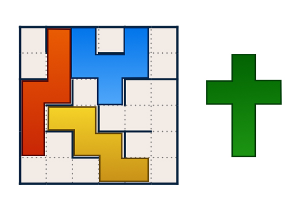 1つ1つ頭の中で動かしながら試していきましょう。赤、黄、青のピースは図のようにして入りますが、緑のピースはどのようにしても入りません。