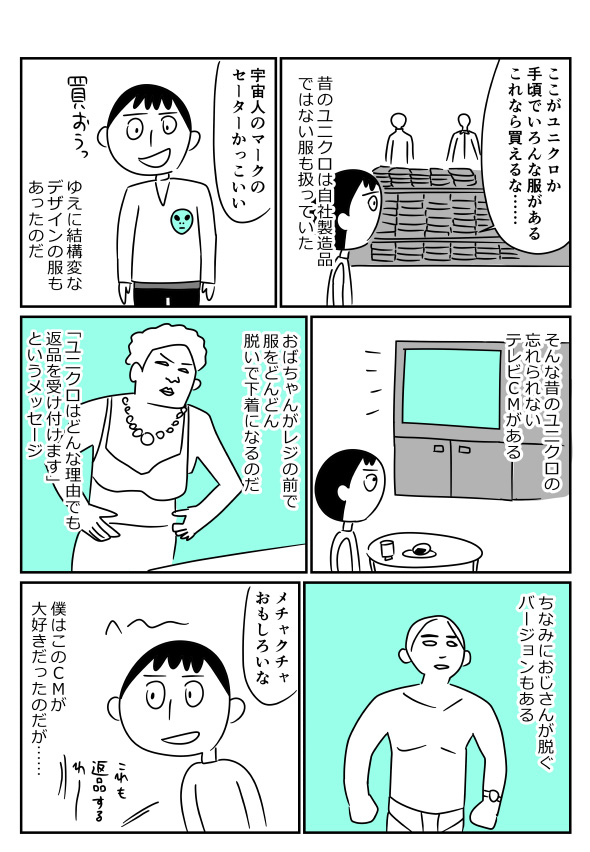 ユニクロで衝撃的だったCMがあります。中年の女性が返品のためにレジ前で服を脱ぎ、最終的に下着姿になって帰ってしまうというもの。印象には絶対に残るのですが、今放送したら確実に炎上ものでしょう。