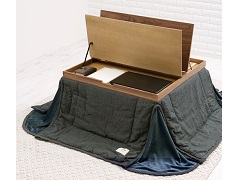 従来のこたつに跳ね上げ式の天板を付けて、内部に収納スペースを設けたもの。ノートPCや雑誌も入れることができ、継脚付きで座椅子とも併用可能。経年変化による狂いの少ない天然木をつかった天板を使用。見た目も落ち着きのあるデザインとなっています。布団を取り外すことで、オールシーズン使用可能です。