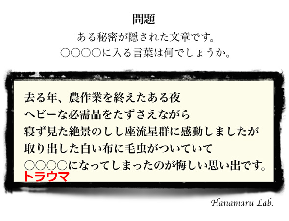 登場していない動物が2つあります。 「うま」「とら」です。これを言葉になるようにつなげて、「トラウマ」が正解。