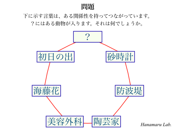 これに該当する動物を考えると「ゆりかもめ」(=「百合鴎」)が見つかります。これ以外にも、該当する動物がいれば正解です。