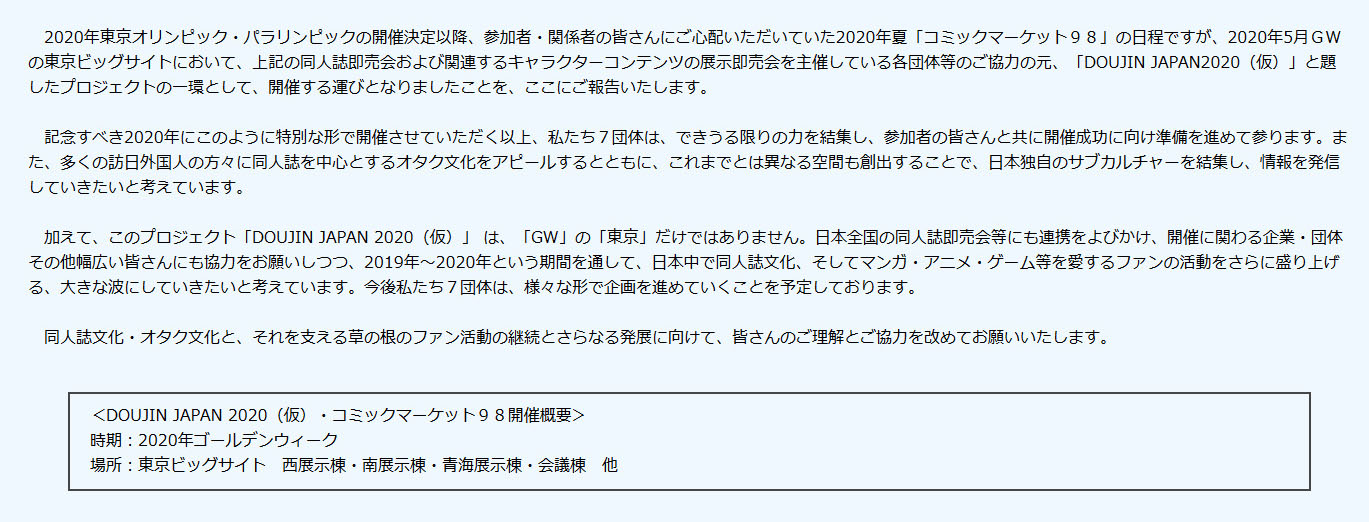 「DOUJIN JAPAN2020(仮)」はコミックマーケット準備会、赤ブーブー通信社、COMIC1準備会、コミティア実行委員会、スタジオYOU、博麗神社社務所、character1 JAPANの7団体による協同プロジェクト。2020年のゴールデンウィークだけでなく、全国の同人誌即売会や関連企業・団体にも協力を呼びかけ、訪日外国人の増加が予想される2019年から2020年にかけ、日本各地でさまざまな企画を進めていきたいとしています。