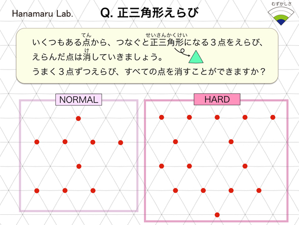いくつもある点から、つなぐと正三角形になる3点を選び、選んだ点は消していきましょう。うまく3点ずつ選び、すべての点を消すことができますか?