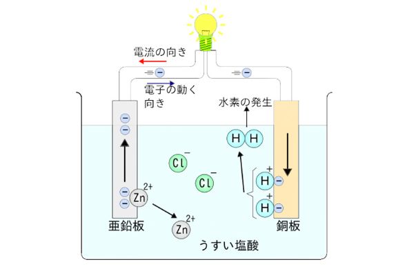 例えば、「ボルタ電池」は、薄い塩酸などに亜鉛板、銅板を浸すことで作ることが可能。2つの板がプラス、マイナスの電極としてはたらくため、それぞれを導線でつなぐと電流が流れます。