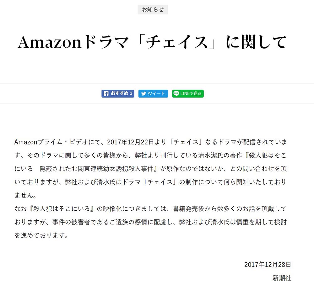 Amazonオリジナルドラマ「チェイス」について、新潮社は12月28日付で「弊社より刊行している清水潔氏の著作『殺人犯はそこにいる 隠蔽された北関東連続幼女誘拐殺人事件』が原作なのではないか、との問い合わせを頂いておりますが、弊社および清水氏はドラマ「チェイス」の制作について何ら関知いたしておりません」とのコメントを発表しました。同作には12月22日の配信後から、「パクリ」「盗作」「著作権侵害」などの声が上がっています。