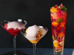 「からくれなゐ」(1600円)は「ちはやぶる 神代もきかず 竜田川 からくれなゐに 水くくるとは」(在原業平朝臣)をもとに、竜田川を赤く染める紅葉の勢いや隠された恋心をフルーツの飾りで表現。華やかなイメージにあわせてシャンパーニュで味を引きしめ、林檎や柑橘類のピール、葡萄のジュレ、ザクロなどで紅葉の様子や着物の絞り染めを表しています。