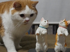 二本足で立つミニチュアのネコさんたちを不思議そうに眺めるうるるくん。うるるくんみたいな長毛の子はフィギュアにするのが難しいのかな。