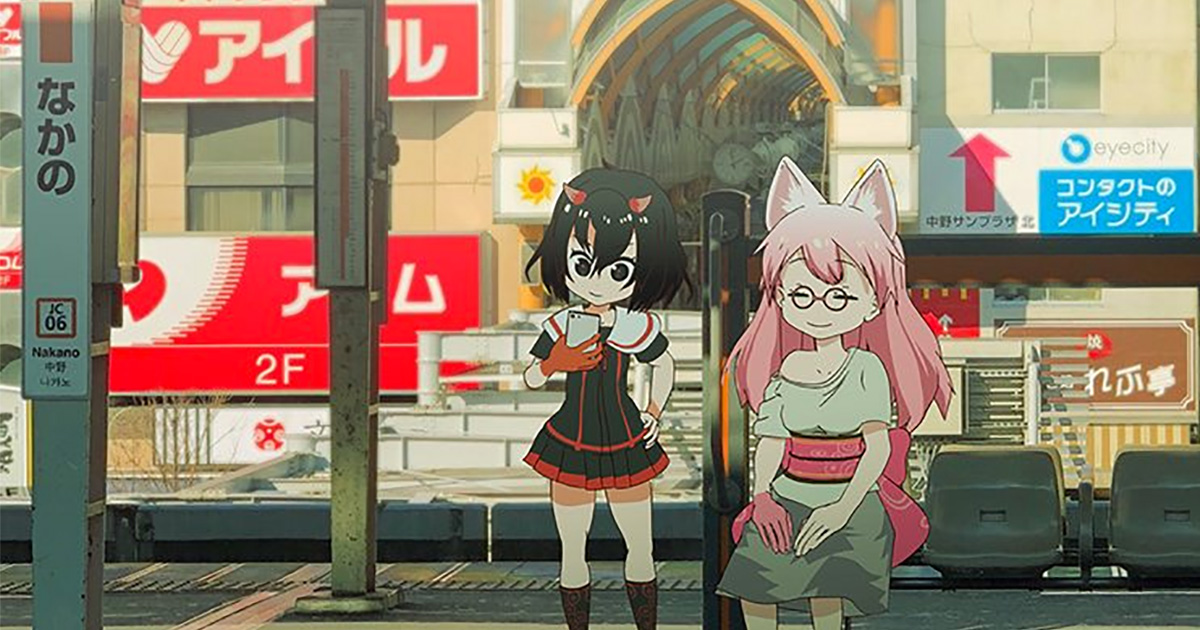 キャラクターはそれぞれ、鬼の角のようなものが生えた黒髪の少女と、キツネを思わせるけも耳が生えたピンク髪の少女。尊さしか感じない愛らしい姿で、中野駅というシチュエーションや黒髪少女の手に持つスマートフォンなどから、舞台設定は現代となっているようです。鬼とキツネだとするか妖怪娘なのか……?