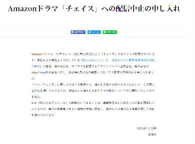 チェイスに対しては12月22日の配信開始後から、清水さんの著作と似ていると指摘する声があり、新潮社は「多くの皆様から、清水氏の著作が原作なのではないか、との問い合わせを頂いておりますが、弊社および清水氏は本ドラマの制作について何ら関知いたしておりません」と同月28日にコメントしていました。