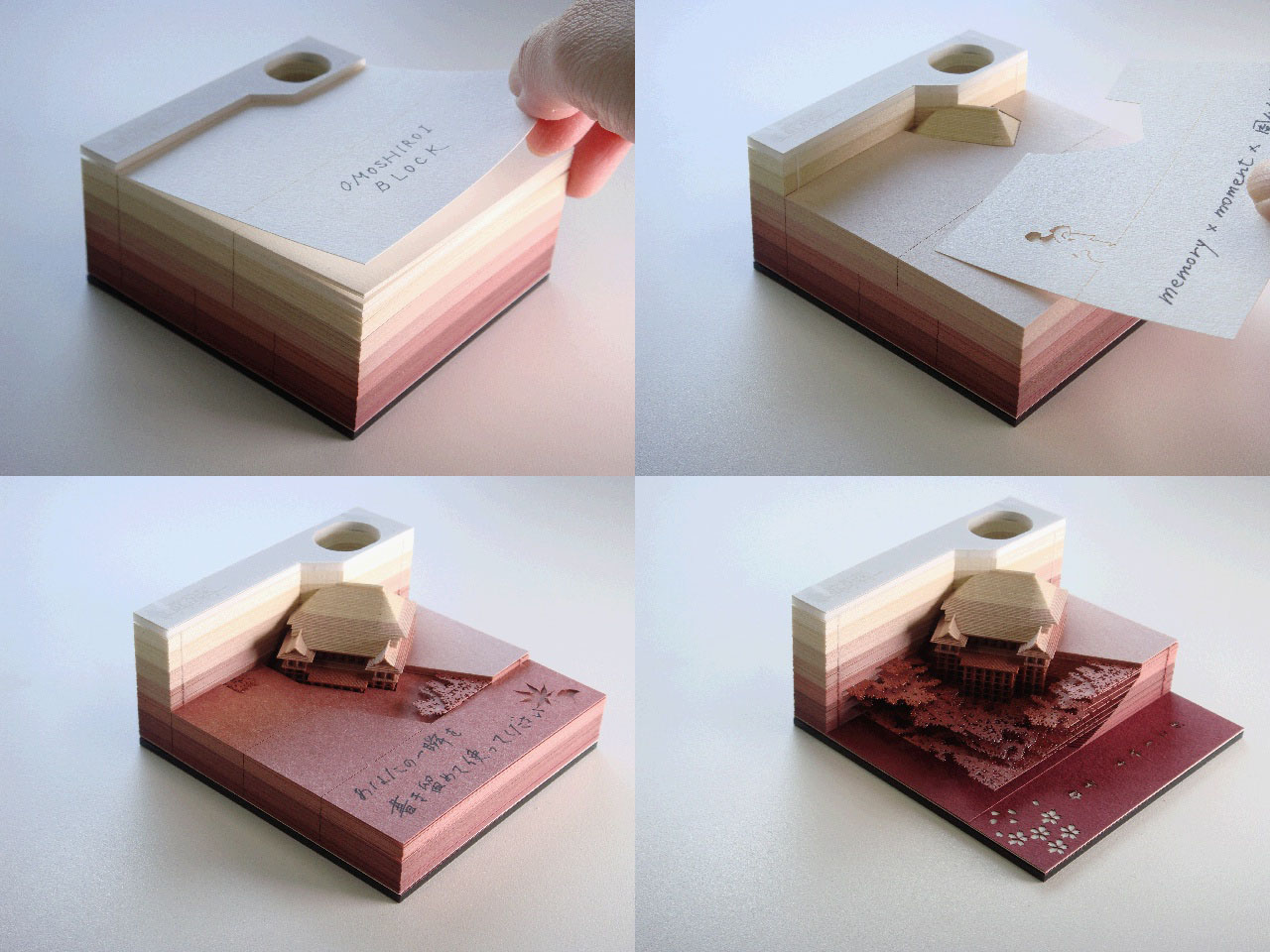 用紙を取っていくと、その跡から精巧な模型が現れる――粋な趣向が凝らされたメモ「OMOSHIROI BLOCK」が注目を集めています。模型見たさに、無闇にメモをとってしまいそう。