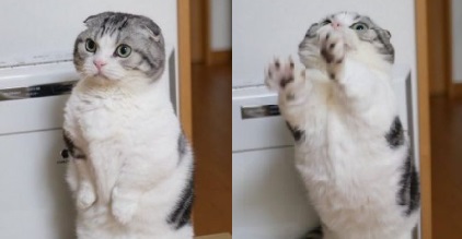段ボール箱の上にちょこんと立ち上がって構えている猫ちゃん。まっぷーちんの愛称でおなじみのマップ君(@map_u_chin)です。どうやら視線の先にご主人の姿が見えているようで、真剣な目をしています。