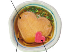 ハートのお揚げが入った「LOVEきつね」は、ピンク色のハート型うどんと、手揚げで仕上げたハート型お揚げ付き。麺、つゆ、揚げのセットで1人前730円(税込)。2017年には1万8000食が完売したとのこと。