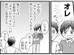 主人公は書店で店長を務める目黒英樹(36歳・独身)。彼が「男には誰しも成長過程でぶち当たる、3つの大きな移行期がある」とする主張で漫画はつづられます。その1つ目は「一人称移行期」。ああ、いつまでも自分を「ボク」と呼んでいると同級生にいじられそうで、なんとなく「オレ」に切り替えたくなる感じ、よく分かるわあ。不思議なことに、年を取ったあとで「僕」のほうがしっくりくる場合もありますけどね。