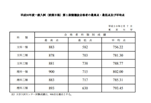 東京大学が2月7日に前期日程試験第1段階選抜の合格者を発表し、その中で合格者の最高点、最低点、平均点を公表。理科一類に出願している受験者の最高点がセンター試験の満点である900点であることが分かりました。