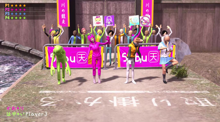 基本的には最大4人で競えるレースゲーム。「エビの着ぐるみを着た青年」「フードにユニコーンのようなツノが付いたジャージ姿の少女」「セーラー服おじさん」「スタイリッシュな犬面人」という、コンセプトに脈絡のない選手たちが町を走って競います。