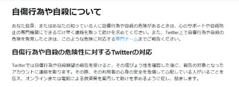 またTwitterは自傷行為や自殺願望の報告を受けると、信ぴょう性を確認した後、対象となった利用者に連絡を取り、心配している人がいることを伝え、利用可能な相談先などのリソースを共有して、助けを求めるよう勧めるとしています。
