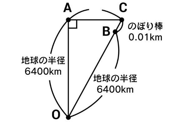 AB=ACとしてよいので、三角形OACについて、三平方の定理を使ってACの長さを求めましょう。10mは0.01kmなので、