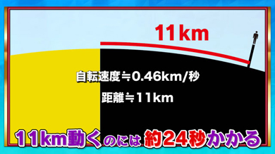 つまり、ABの長さは11.3kmとなります。もう答えは目前です。地面は24時間(=86400秒)で40000km動くことを考えると、11.3km動くのにかかる時間は、
