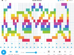 画面内のグリッドをタップしたりなぞったりするだけで誰でも曲が作れ、左下の再生を押すと設定したテンポでループ再生されます。単純に下のグリッドから「ドレミファソラシド」となっているので、慣れれば好きなメロディも作れます。鳴らす楽器は画面下からピアノやマリンバ、木管楽器などを選択可能です。
