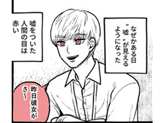 孤独な少年・真壁は、なぜかウソをついている人間の目が赤く見える能力を手にします。教室を見回してみると、同級生の目はもれなく真っ赤でウソつきだらけ。そんなある日、彼は赤澤という少女から告白されます。しかし、「付き合ってくれない?」と言う彼女の目は、真壁には赤く見えるのでした。