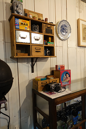 暗室に入る、という経験自体が初めてでした。ほんのり酸っぱいにおいがするのは、現像に使う酢酸のものだそうです。アウラ舎さんは、1階はカフェ、2階は時間貸しの暗室で、暗室は最大2名が利用できるとのこと。確かに、1階もよくみると、カメラ推しのディスプレイです。