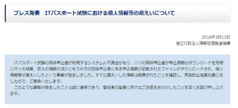 IPA(独立行政法人情報処理推進機構)は3月13日、ITパスポート試験申込者の個人情報が漏えいしたことを報告しました。