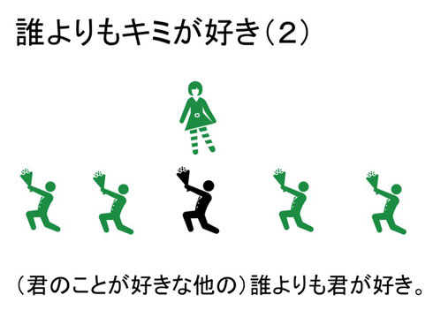 どうでしょうか? この文には2つの内容があります。1つは、「(他の女の子の)誰よりも君が好き」で、もう1つは「(君のことが好きな他の)誰よりも君が好き」という内容です。