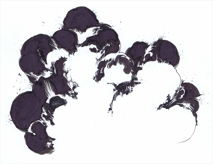 また所々に筆ペンを使用してシャッと細い線を重ねたり、煙がうねっているように描いたりすると、よりリアルな爆発エフェクトになるので、ぜひ取り入れてみましょう。