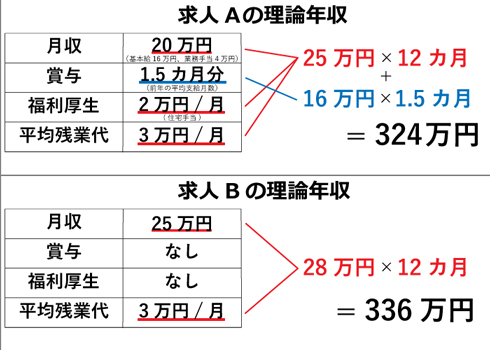 求人Aには賞与も福利厚生もありますが、求人Bにはありません。何となく見比べるだけだと、求人Aの方が良く見えるかもしれません。しかし、「理論年収」を割り出してみると、実際には求人Bの給与条件の方が良いことが分かります。