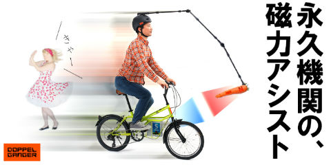 ビーズは磁力で自転車の推進力を生み出す、磁力アシスト自転車「330-NS(マグネティック・フォース)」を発売しました。付属ヘルメットの先端に装着したN極ユニット(Arctic Unit)とフレームの中央に搭載したS極ユニット(Antarctic Unit)が、磁力によって相互に引き合うことで推進力を得るというもの。脚力も電気も不要です。