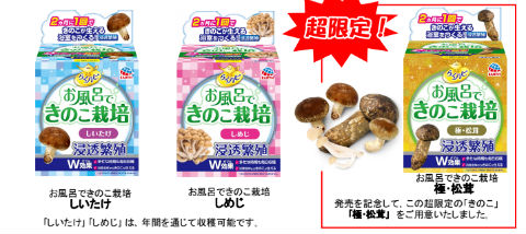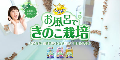 アース製薬が「らくハピ お風呂の防カビ剤」の研究から逆の発想で開発した「らくハピ お風呂できのこ栽培」を発表。防カビ剤の特長「汚れを突き破る浸透力」に「きのこの種菌」を加えることで、お風呂でのきのこ栽培を可能に。2カ月に1回使用するだけで 4人家族分の「きのこ」をまかなえるとのこと。種類は「しいたけ」「しめじ」「極・松茸」の3種。