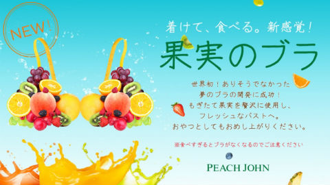 ピーチジョンがもぎたてフルーツをふんだんに使った「果実のブラ」の開発に成功しました。カップ部分にフルーツを桃、オレンジ、イチゴなど産地直送、もぎたての新鮮な果実12種類をあしらっています。どんな人にもフィットする豊富なサイズ展開を実現するため、例えばBカップで使用しているぶどうはデラウェア、C・Dカップは甲州、E・Fカップは巨峰というように、カップのサイズによって最適な品種を選んで開発したとのこと。ビタミン補給やおやつにも使えますが、食べ過ぎるとブラがなくなるのでご注意を。