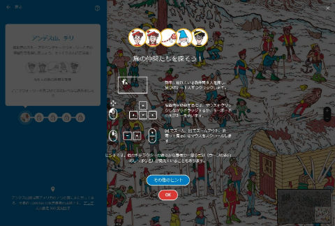 Googleマップを開いてちらりと見えるウォーリーをクリックするとスタート。群衆のイラストが表示され、その中からウォーリーとウェンダなどの旅仲間を見つけます。レベル1から結構難しいんですけどこれ……!