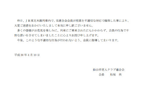 仙台市老人クラブ連合会は10日、「JR東北本線列車内で、当連合会会員が座席を不適切な対応で確保した事により、大変ご迷惑をおかけいたしまして本当に申し訳ございません」と謝罪文を公開。