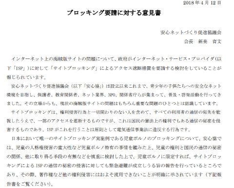 JAIPAは著作権侵害への対応は重要としつつも、「より影響の少ない他の手段も考えられる中で、必ずしも唯一残された手段とはいえないブロッキングを対抗手段とすることまでが現行法上許容されるとは考えられません」と主張。政府が特定のサイトへの遮断を求めることは検閲にあたる恐れもあるとしています。