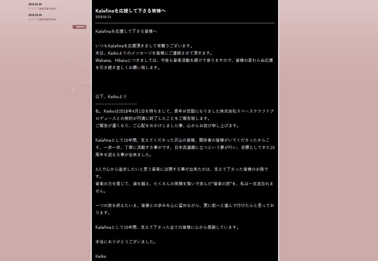 Keikoさんのメッセージとして紹介された内容は、契約終了に伴い4月1日付けで円満退社した報告と、報告が遅くなったことへの謝罪。1月には日本武道館ライブも実現したKalafinaの10年間に対する関係者やファンへの感謝の気持ちをつづり、「音楽の力を信じて、海を越え、たくさんの笑顔を繋いで歩んだ“音楽の旅”を、私は一生涯忘れません」とつづりました。