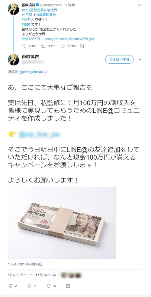 問題のリプライは「あ、ここにて大事なご報告を!」という文言ではじまるもの。現金が当たるとしてLINE@の友達追加をするように呼び掛けるという、いわゆる宣伝ツイートです。