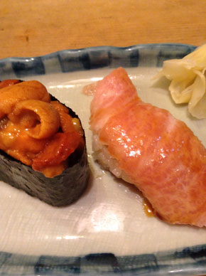 築地のウニ丼と、別の店の握り。ウニを撮り慣れておらず、ピントが合っていない