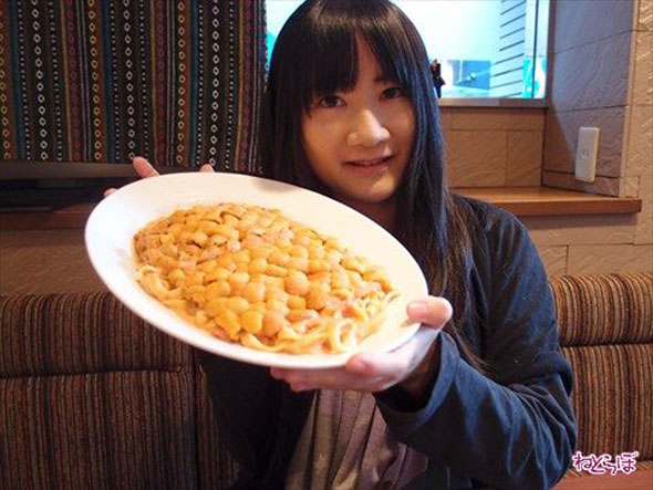 顔よりも大きいお皿に盛られたウニまみれのパスタ