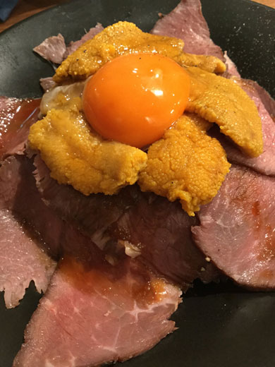 通りすがりに「ウニのローストビーフ丼」の文字が見えたので、吸い寄せられるように店内へ。店の名前は覚えていないけれど、手帳を見返すと高田馬場だった可能性が高い。ウニと肉の上に、卵黄を乗せるのはズルい、と思った。