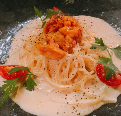 ウニの食べ比べ以外の料理もすごい。前菜はウニと牡蠣と生カラスミが挟まったミニバーガー。ウニとイクラとキャビアとトリュフがこんもり乗った安納芋のクレマ。パスタよりもウニの量のほうが多いウニパスタ。ウニキャラメルのソースがかかった烏骨鶏のパンナコッタ。