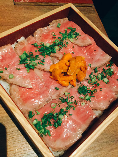 青山の「焼肉ホルモン 青一」で「肉うに」と「ローストビーフうに重」を食べた。