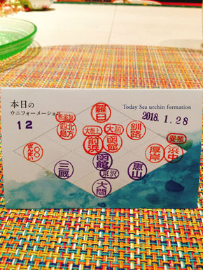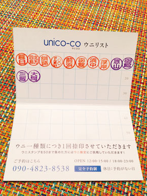 そこそこシャレたイタリアンレストランなのに、ウニを食べた回数にスタンプ制を導入しているあたり、何かがおかしい。季節や産地でまったく味わいが変わるウニをたくさん食べに来てほしい、という店主のはからいから生まれたシステムである。季節によって日本全国のウニが食べられるらしい。紫色のスタンプはムラサキウニ、朱色のスタンプはバフンウニである。